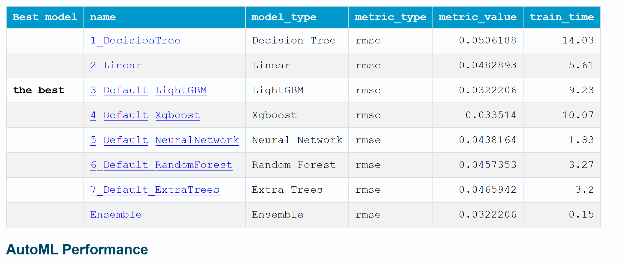 AutoML_class_obj.fit()AutoML directory: AutoML_20 The task is regression with evaluation metric rmse AutoML will use algorithms: ['Linear', 'Decision Tree', 'Random Forest', 'Extra Trees', 'LightGBM', 'Xgboost', 'Neural Network'] AutoML will ensemble availabe models AutoML steps: ['simple_algorithms', 'default_algorithms', 'ensemble'] * Step simple_algorithms will try to check up to 2 models 1_DecisionTree rmse 0.050619 trained in 14.53 seconds 2_Linear rmse 0.048289 trained in 6.58 seconds * Step default_algorithms will try to check up to 5 models 3_Default_LightGBM rmse 0.032221 trained in 9.8 seconds 4_Default_Xgboost rmse 0.033514 trained in 10.93 seconds 5_Default_NeuralNetwork rmse 0.043816 trained in 1.96 seconds 6_Default_RandomForest rmse 0.045735 trained in 3.66 seconds 7_Default_ExtraTrees rmse 0.046594 trained in 3.48 seconds * Step ensemble will try to check up to 1 model Ensemble rmse 0.032221 trained in 0.17 seconds AutoML fit time: 56.1 seconds AutoML best model: 3_Default_LightGBM Model has been saved in the path C:\Users\Karthik\Desktop\Base\AutoML\AutoML_20