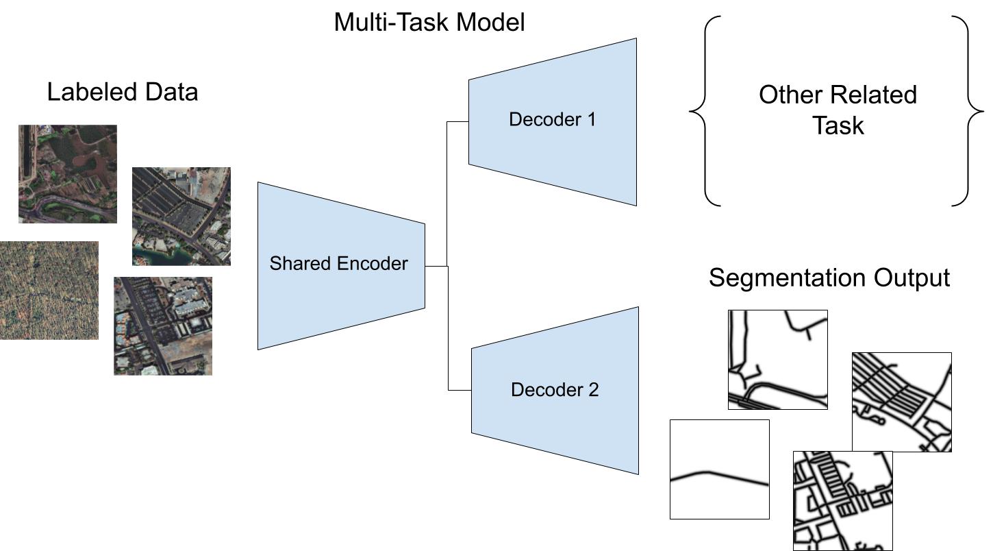 The multi-task learning mechanism [2] is inspired by human beings to acquire knowledge of complex tasks by performing different shared sub-tasks simultaneously i.e. in-parallel. It improves the performance by inducing mutual information of the tasks in the learning process. In deep learning, the common architecture for multi-task learning consists of an encoder and multiple decoders to perform predictions of related tasks (As shown in Figure. 1). For the road extraction system, we have one task i.e. identifying road pixels and in the next section, we will introduce the other task.
