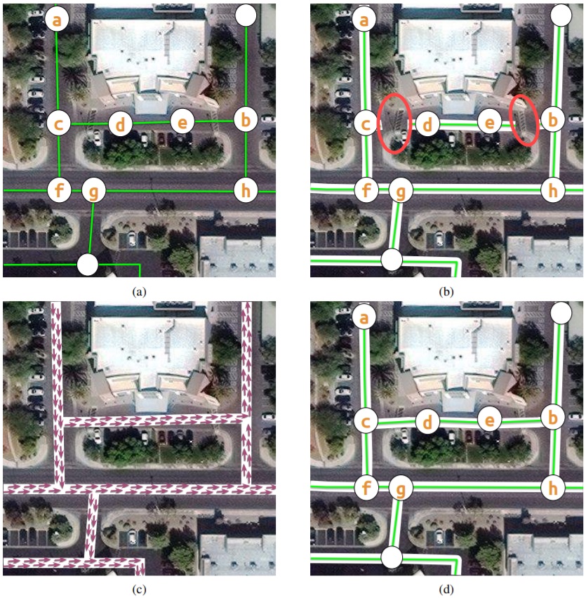 As the annotators, trace lines using the highlighted nodes, (As shown in Figure. 3) along the center of roads with a traversable shortest path (a, c, d, e, b) for a road route a → b. The fragmented road network is estimated using binary segmentation algorithms such as PSPNet, UNet, etc. which results in the path (a, c, f, g, h, b) for the route a → b, which is not the shortest route. The annotators use additional knowledge for orientation for tracing roads to achieve this connectivity.
