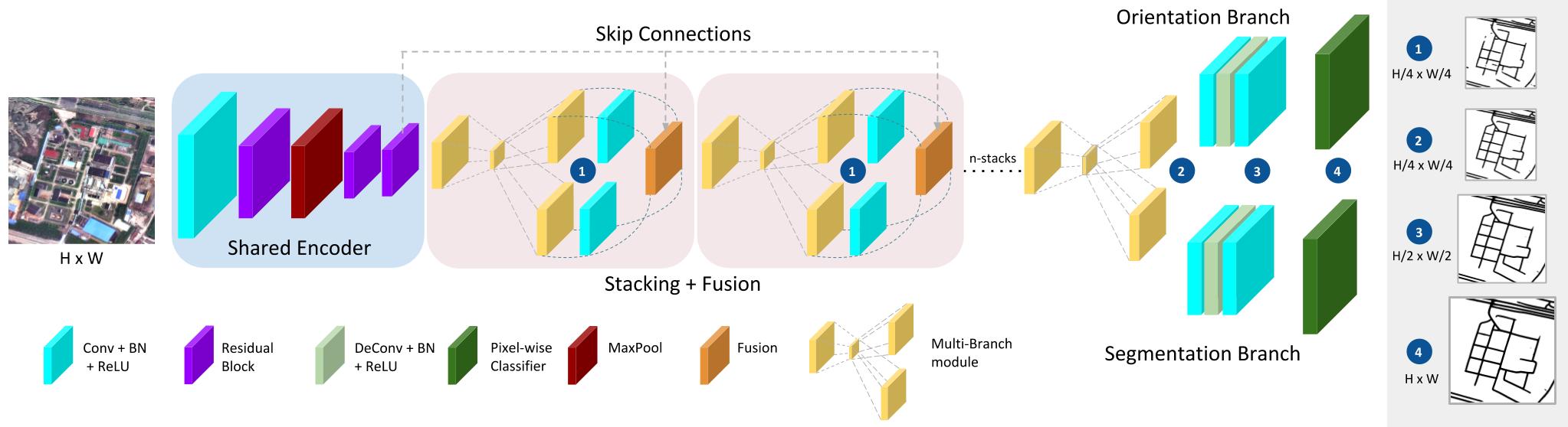 Figure 4: Stacked Encoder-Decoder architecture for Multi-Task Road Extractor framework.
