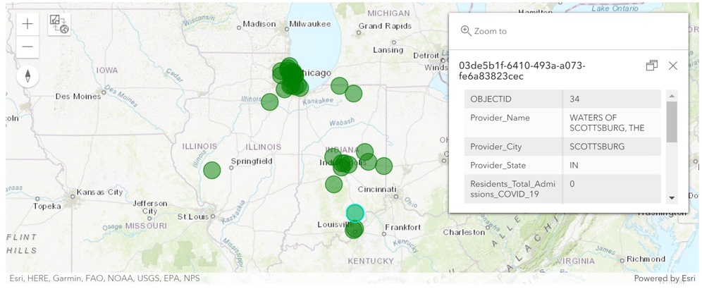 Points displayed on the map show location of each nursing home in our data with at-least 1 case and 1 death. Clicking on a point displays attribute information for that nursing home.