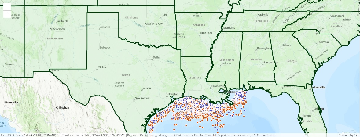 'snippet':'Map created using Python API showing locations of US oil platforms and crude trunks.',