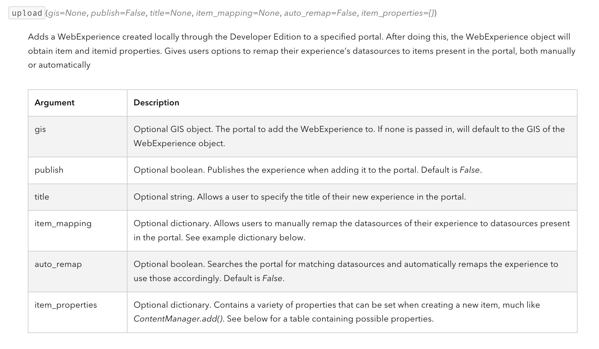 One final note is that as of ArcGIS API for Python version 2.4.0, locally created experiences uploaded to a portal will also copy the experience's image resources as well- so if you have embedded images in your experience, those will get carried over, portrayed in your experience, and stored in the experience item's resources.