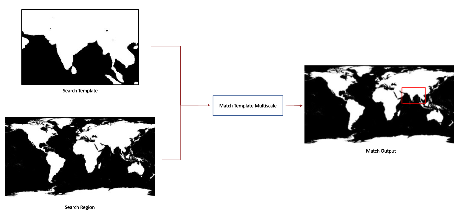 This method finds the location of the best match of a smaller image (template) in a search region image (for instance, world map) assuming it exists in the larger image. Multiple scales of the bigger image are used for this task because template matching is not scale-invariant.