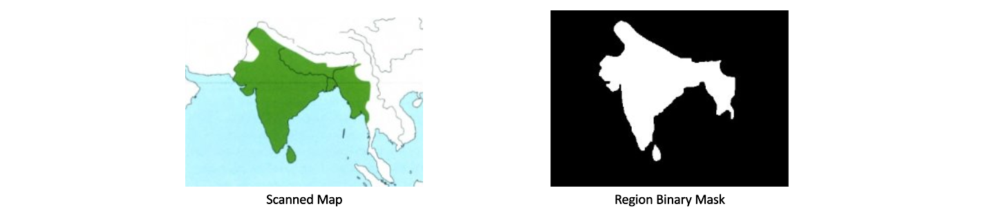 This method is the final step in the pipeline that maps the species' regions on the search region image (for instance, world map) using the computed transformations. Also, it generates the shapefiles for the species' region that can be visualized using ArcGIS Pro and further edited. Additionally, it generates a combined shapefile for all the species' region corresponding to all the scanned map images.