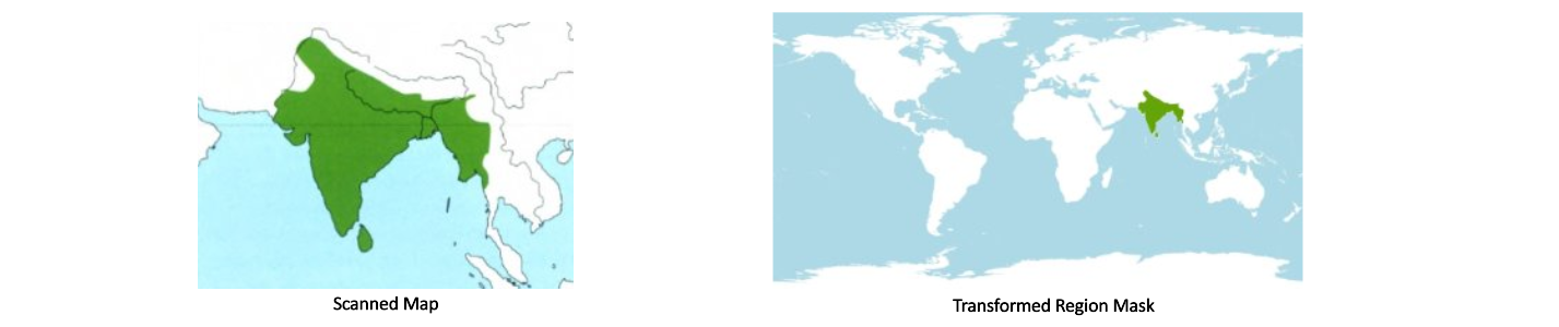 This method is the final step in the pipeline that maps the species' regions on the search region image (for instance, world map) using the computed transformations. Also, it generates the shapefiles for the species' region that can be visualized using ArcGIS Pro and further edited. Additionally, it generates a combined shapefile for all the species' region corresponding to all the scanned map images.