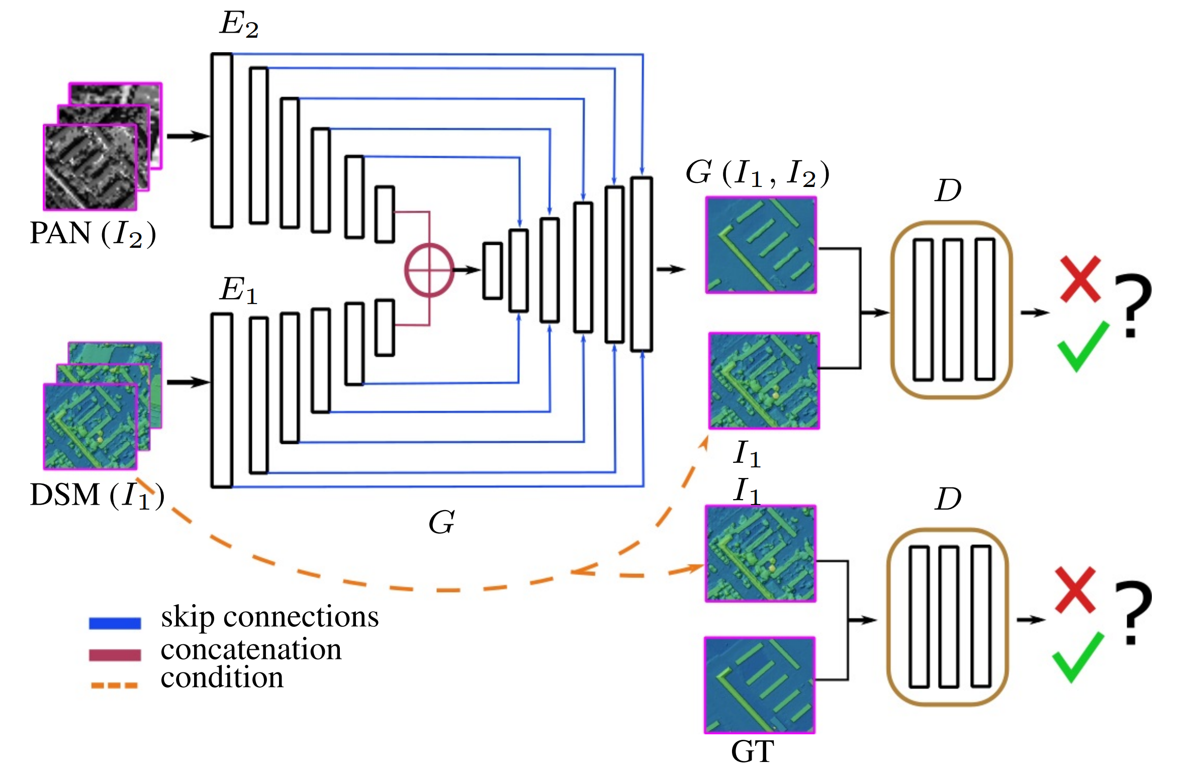 In this guide, we will focus on WNet_cGAN [4], which blends spectral and height information in one network. This model was developed to refine or extract level of details 2 (LoD2) Digital Surface Model (DSM) for buildings from previously available DSM using an additional raster, such as panchromatic (PAN) imagery. This approach can help in the extraction of refined building structures with higher levels of detail from a raw DSM and high resolution imagery for urban cities.