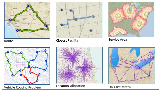 Network Analysis (NA) services are being called by the ArcGIS Network Analysis solvers (e.g. route, closest facility, service area, location-allocation, origin-destination cost matrix, and the vehicle routing problem). Users can choose between ready-to-use NA services hosted on ArcGIS Online, or customized NA services on enterprise that they have previously published and configured by themselves. If you perform an analysis using ArcGIS Online, the solver references a high-quality, worldwide network datasets stored in the ArcGIS Online cloud and will use ArcGIS Online credits. If you're using your own data, no online credits are used, but you need to associate your network datasets with the project [1].