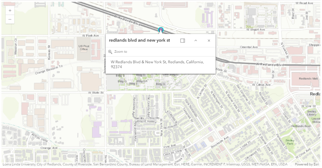 As we will see in the example below, when the location_type="rooftop", map rendering of the specific point uses the rooftop point, which reflects the detailed location of PointAddress better. When location_type="street", map rendering of the returned geocoded result usually plots the point at the street.