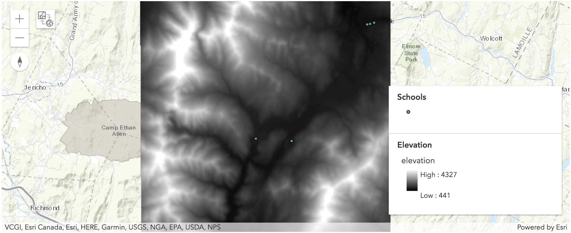 In order to create viewshed, we need an input surface raster layer and an observer feature layer. In this example, we will use an elevation layer as the input raster and a few points representing schools as the observer layer.