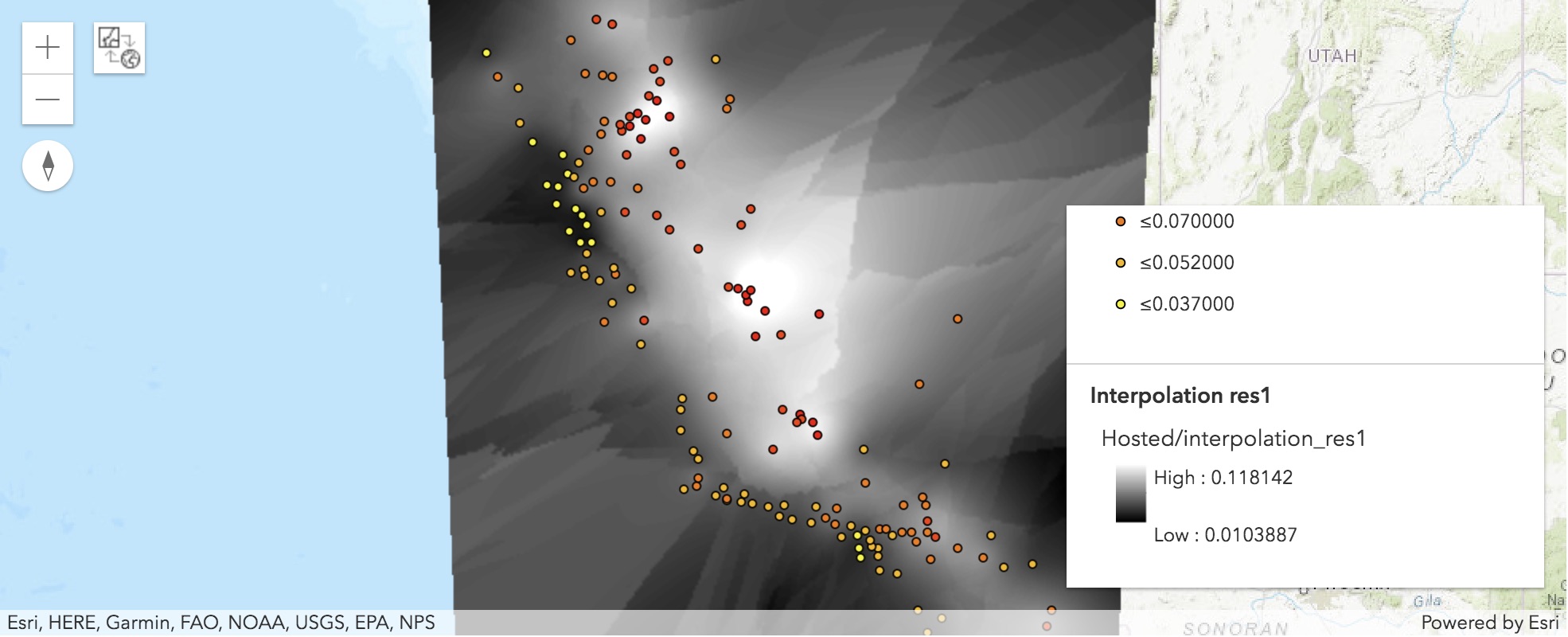 In this example, we use ozone concentration point samples (measurements) in California to produce a continuous surface (map) predicting the values of ozone concentration for every location throughtout the state.