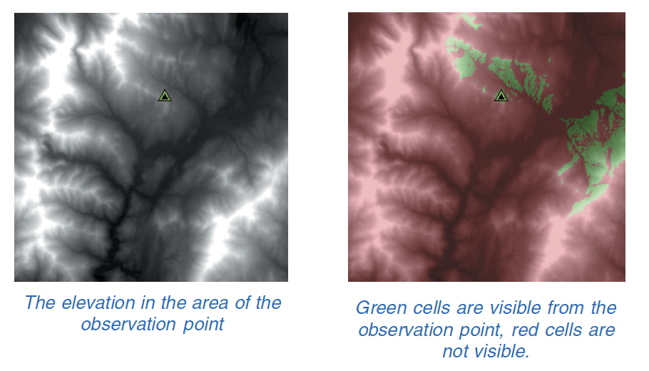 Viewshed indentifies the cells in an input raster that can be seen from one or more observation points or lines. Each cell in the output raster receives a value that indicates how many points or lines can be seen from each location. Viewshed is very useful when you want to know how visible objects might be, such as finding well-exposed places for communication towers.