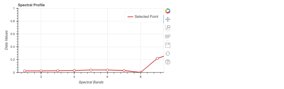 The get_samples method can also estimate which type of land cover most closely matches any point on the map by comparing their spectral profiles. The example below adds a 'click handler' to the map widget. When the map is clicked, a spectral profile for the clicked location is displayed using the bokeh charting library.