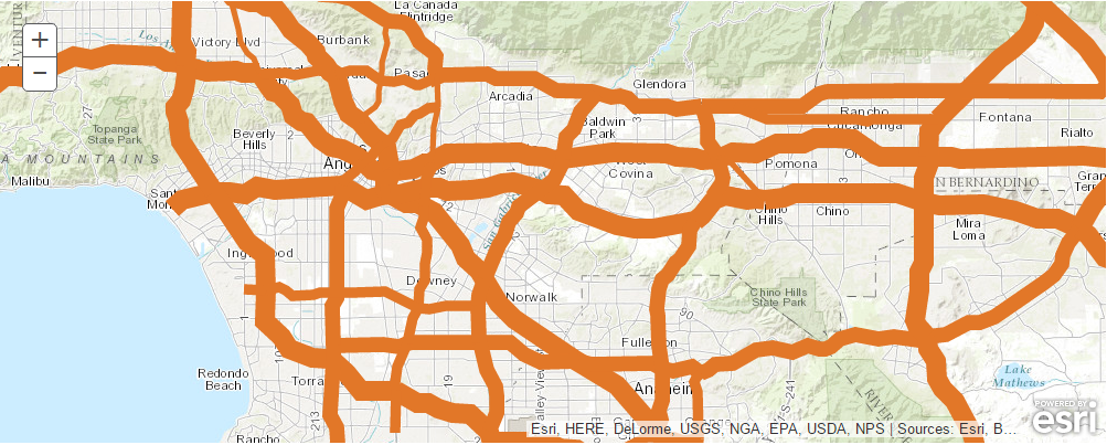 map1.center = [34, -118]map1.zoom = 10Thus, we represented longer freeways as thicker lines and shorter ones with thinner lines.