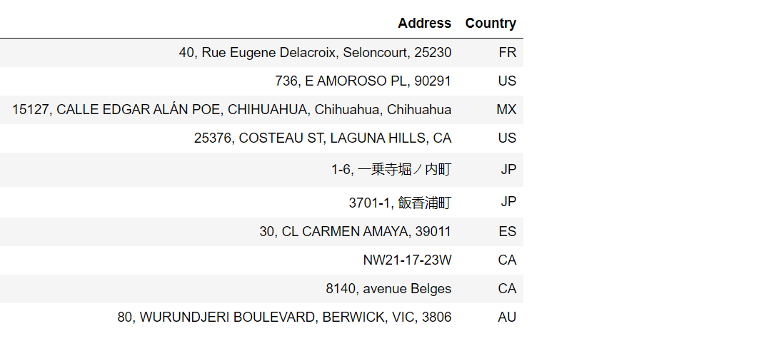 df = pd.DataFrame(result, columns=["Address", "CountryCode", "Confidence"])