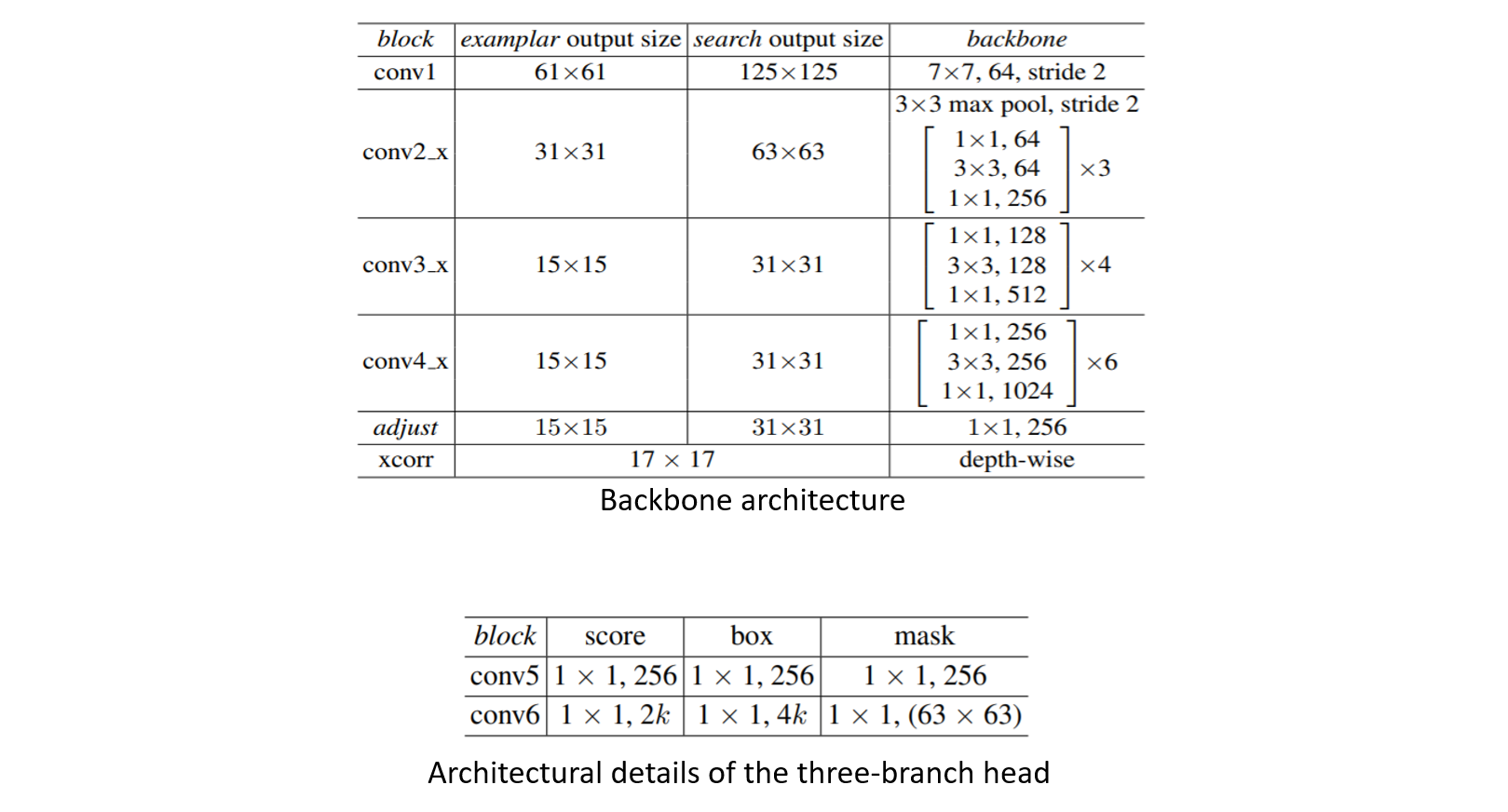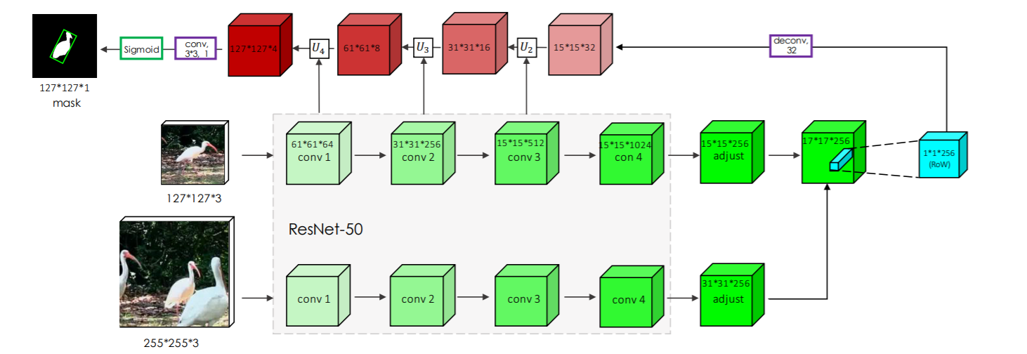 Backbone SiamMask uses ResNet-50 as backbone. The architecture depicted below uses the first 4 stages of ResNet, adjust layer and depth-wise cross-correlation resulting in a feature map of size 17×17.