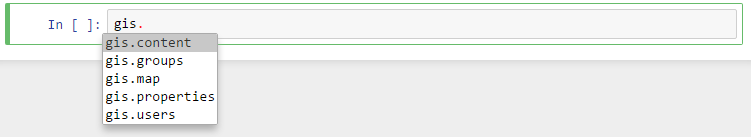 The GIS object in the gis module is the most important object when working with the ArcGIS API for Python. The GIS object represents the GIS you are working with, be it ArcGIS Online or an instance of ArcGIS Enterprise. You use the GIS object to consume and publish GIS content and administrators may use it to manage GIS users, groups and datastores. This object becomes your entry point in your Python script when using the API.