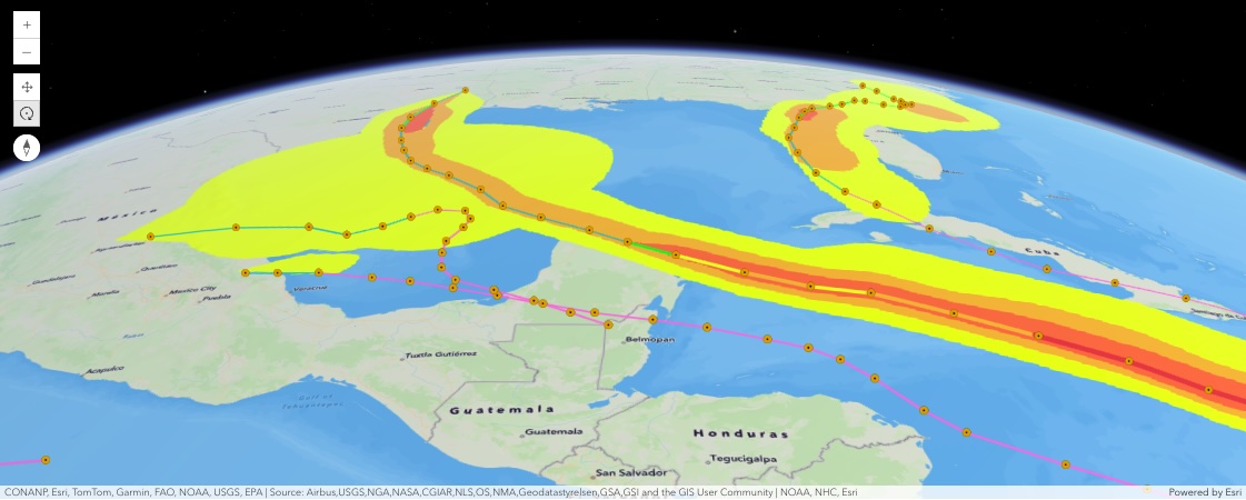 scene_obj.center = [20.138470, -88.870125]note: Use the rotate button to change the tilt and elevation position values to observe 3D properties and create a view like that above. You can print out the camera properties after using the interactive buttons to see how the camera operates: