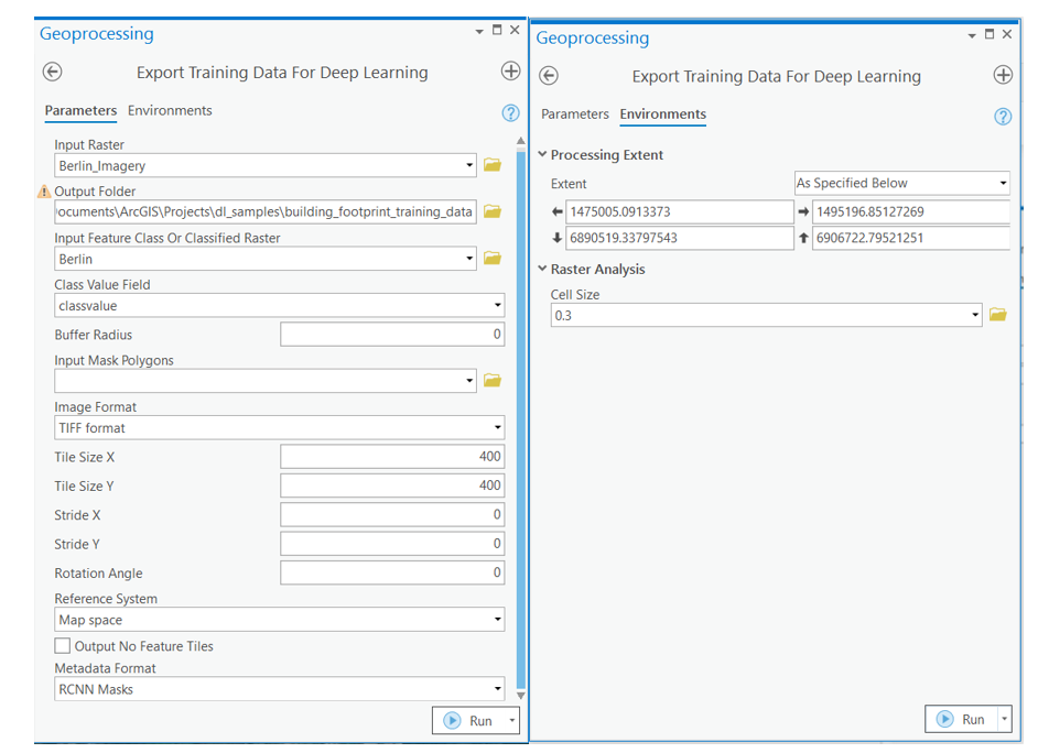 arcpy.ia.ExportTrainingDataForDeepLearning("Berlin_Imagery", r"D:\data\maskrcnn_training_data_maskrcnn_400px_30cm", "berlin_building_footprints", "TIFF", 400, 400, 0, 0, "ONLY_TILES_WITH_FEATURES", "RCNN_Masks", 0, "classvalue", 0, None, 0, "MAP_SPACE", "PROCESS_AS_MOSAICKED_IMAGE", "NO_BLACKEN", "FIXED_SIZE")