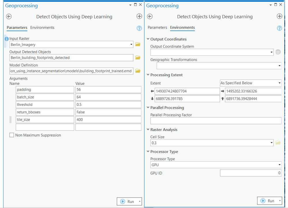 arcpy.ia.DetectObjectsUsingDeepLearning("Berlin_Imagery", r"\\ArcGIS\Projects\maskrcnn_inferencing\maskrcnn_inferencing.gdb\maskrcnn_detections", r"\\models\building_footprint_10epochs\building_footprint_10epochs.emd", "padding 100;batch_size 4;threshold 0.9;return_bboxes False", "NO_NMS", "Confidence", "Class", 0, "PROCESS_AS_MOSAICKED_IMAGE")