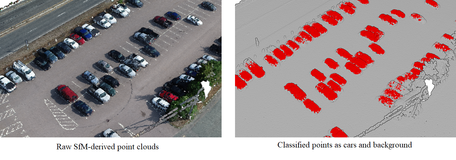 - Classify points representing cars in SfM-derived point clouds using the API's RandLANet model. A model is trained for two classes, 'cars' and 'background'. Apart from the geometric information in the data, additional attributes (Red, Blue, and Green), are also used for model training.