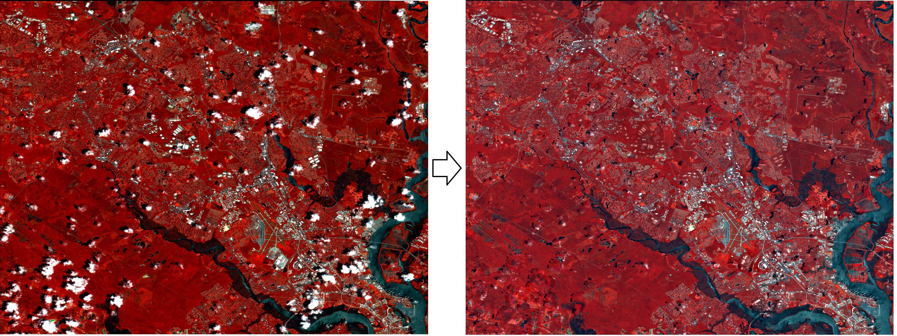 The goal of this notebook is to detect and replace the cloud-contaminated region of the satellite images. Clouds often create obstructions in satellite imagery that can hinder results in processes like land cover classification and time series analysis. From a general perspective, this can be seen as an image denoising problem, where clouds are considered as noise in relation to the land surface in images. In this notebook, we will detect and replace cloud-contaminated regions of satellite imagery by combining a pretrained deep learning model, available in Living Atlas, with an image processing technique available in raster functions.