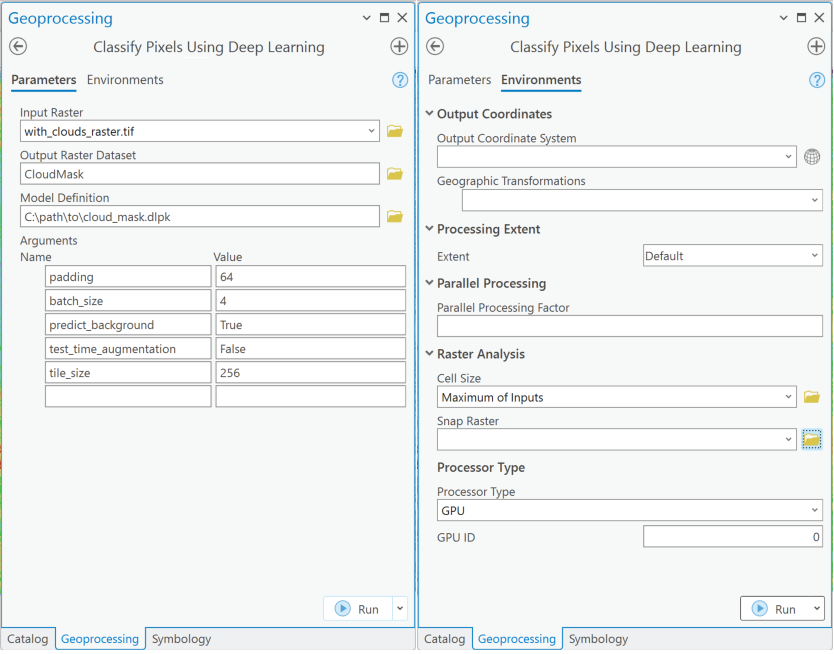 The cloud mask generation pre-trained model, trained on sentinel-L2A imagery is used to generate cloud mask for input raster. The pre-trained model is used in Classify Pixels Using Deep Learning tool resulting in a segmented cloud mask raster. Other ways of generating cloud mask include using sentinel2 cloud detector by ESA. The cloud mask is used by Stepwise local radiometric adjustment (SLRA) raster function as guidance for removal of cloud-contaminated pixels in the target raster.