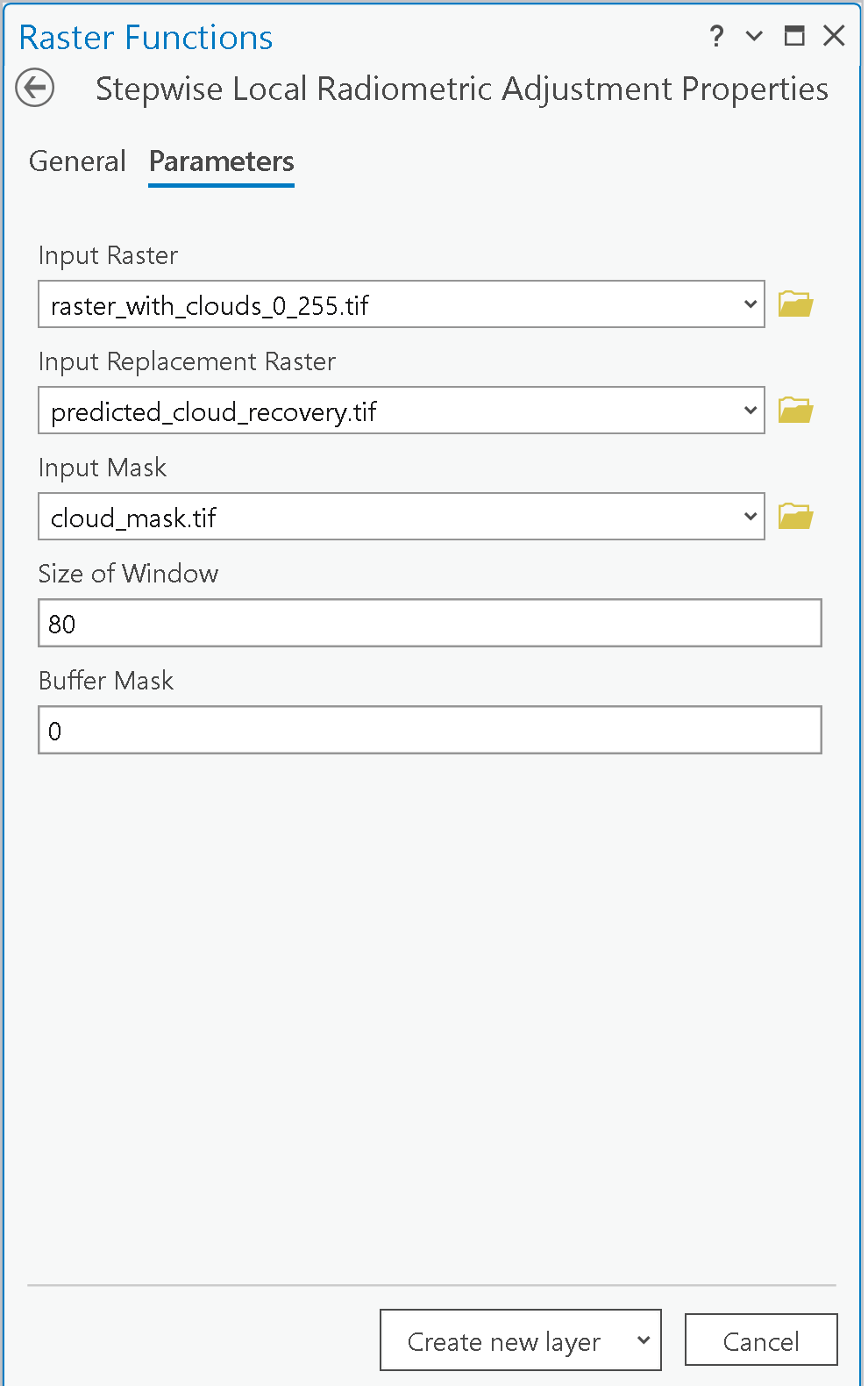 Input Raster: cloud covered imageryInput Replacement raster: replacement rasterInput Mask: generated cloud maskSize of Window: default set to 80, can be any multiple of 20Buffer Mask: any value between 0-15, accordiong to coverage of cloud mask