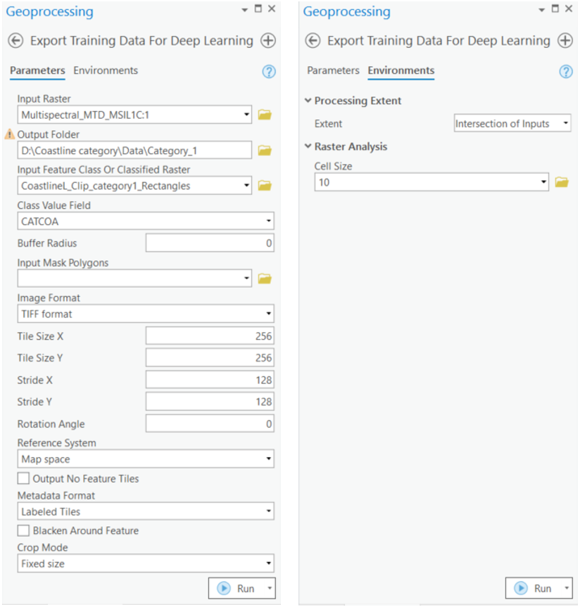 We then repeated this process for each coastline category to ensure comprehensive coverage. Once all categories were processed, we exported the dataset using the Labeled Tiles metadata format over a small area containing multiple coastline types. This was done using the Export Training Data For Deep Learning, available in both ArcGIS Pro and ArcGIS Image Server.