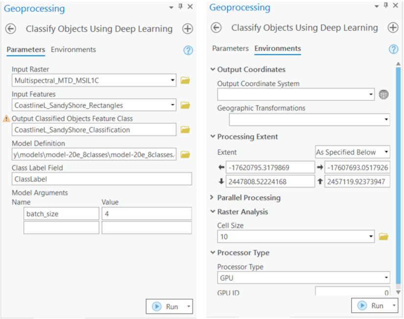 Input Raster: Sentinel2 imageryInput Features: Output from theGenerate Rectangles Along coastlinestool.Output CLassified Objects Feature Class: Output feature class.Model Definition: The model that we trained.Class Label Field: Feild name that will contain the detected class number.Environments: Set optimumCell Size,Processing ExtentandProcessor Type.