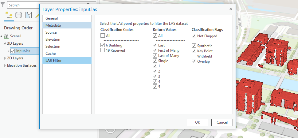 The model builder takes filtered 'building points' as 'input' ('LAS filter' can be used for this, as shown in figure 9). In this post-processing pipeline, important prior information is that "no building will have a very small area". This information is used to apply 'area-based thresholding' using Select by Attribute and reduce the noise polygons generated from noise points. If needed, this 'area-based threshhold value' can be changed by editing the model builder.