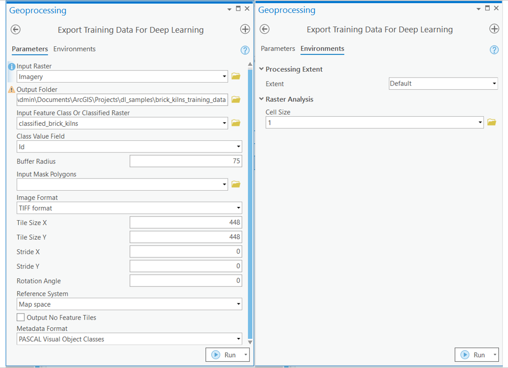 arcpy.ia.ExportTrainingDataForDeepLearning("Imagery", r"C:\sample\Data\Training Data 448px 1m", "brick_kilns_2019_classified_point", , "TIFF", 448, 448, 0, 0, "ONLY_TILES_WITH_FEATURES", "PASCAL_VOC_rectangles", 0, "Id", 75, None, 0)