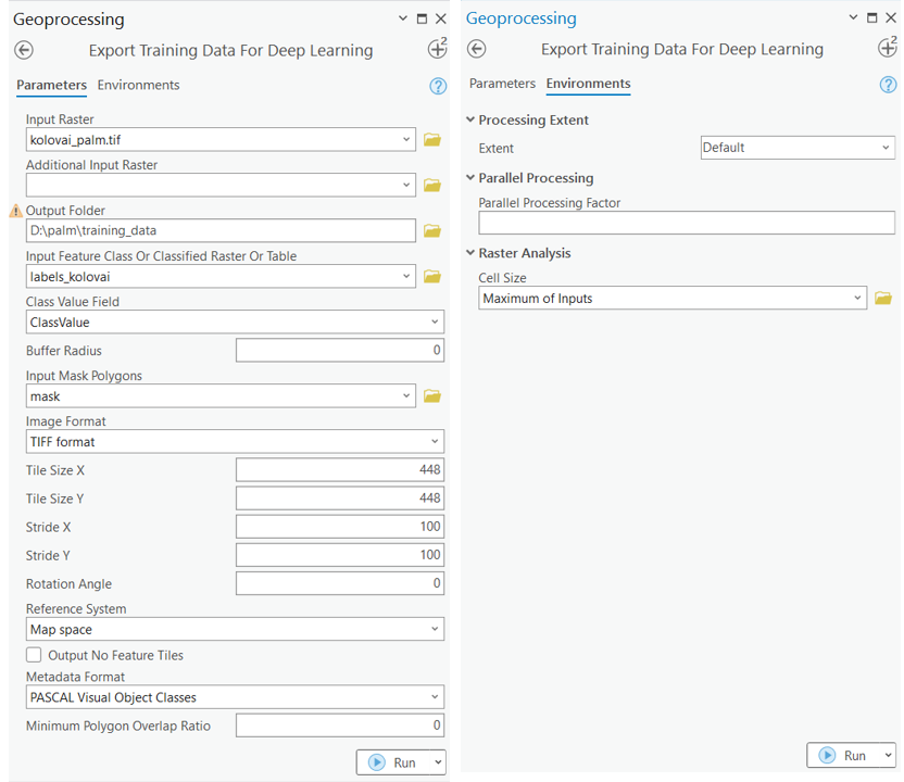 palm_labelTraining data can be exported by using the Export Training Data For Deep Learning tool available in ArcGIS Pro. For this example, we prepared the training data in the 'PASCAL Visual Object Classes' format, using a 'chip_size' of 448px and a 'cell_size' of 0.085, in ArcGIS Pro. The 'Input Raster' and the 'Input Feature Class' have been made available to export the required training data. We have also provided the exported training data in the next section, if you wish to skip this step.
