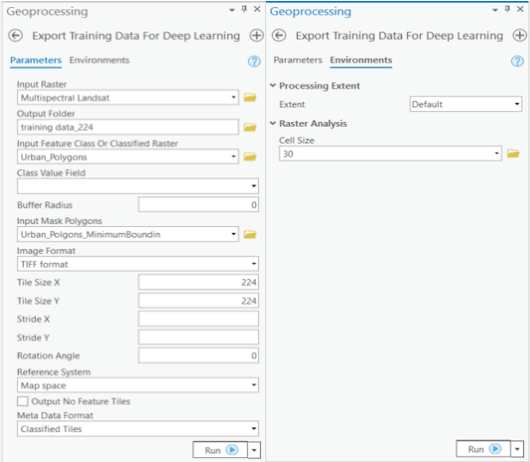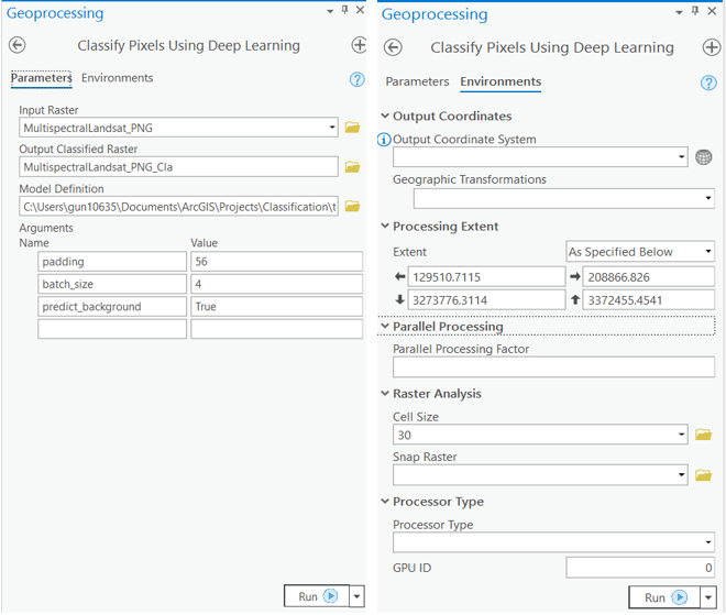 Input Raster: The raster layer from which we want to extract settlements from.Model Definition: It will be located inside the saved model in 'models' folder in '.emd' format.Padding: The 'Input Raster' is tiled and the deep learning model classifies each individual tile separately before producing the final 'Output Classified Raster'. This may lead to unwanted artifacts along the edges of each tile as the model has little context to predict accurately. Padding as the name suggests allows us to supply some extra information along the tile edges, this helps the model to predict better.Cell Size: Should be close to at which we trained the model, we specified that at the Export training data step .Processor Type: This allows to control whether the system's 'GPU' or 'CPU' would be used in to classify pixels, by 'default GPU' will be used if available.Parallel Processing Factor: This allows us to scale this tool, this tool can be scaled on both 'CPU' and 'GPU'. It specifies that the operation would be spread across how many 'cpu cores' in case of cpu based operation or 'no of GPU's' in case of GPU based operation.