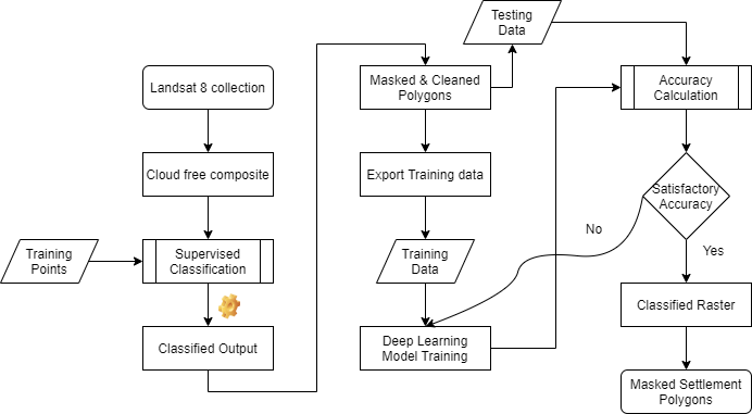 Deep-Learning methods tend to perform well with high amounts of data as compared to machine learning methods which is one of the drawbacks of these models. These methods have also been used in geospatial domain to detect objects [1,2] and land use classification [3] which showed favourable results, but labelled input satellite data has always been an effortful task. In that regards, in this notebook we have attempted to use the supervised classification approach to generate the required volumes of data which after cleaning was used to come through the requirement of larger training data for Deep Learning model.