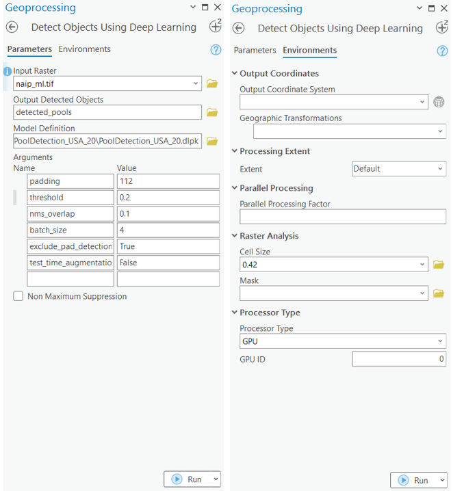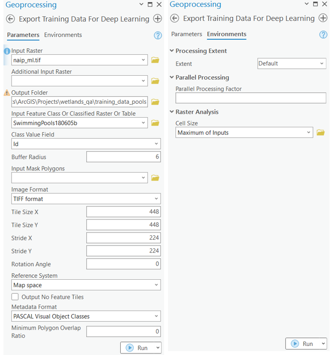 naip_itemWith the feature class and raster layer, we are now ready to export training data using the 'Export Training Data For Deep Learning' tool in arcgis Pro. In addtion to feature class, raster layer, and output folder, we also need to speficy a few other parameters such as tile size (size of the image chips), stride size (distance to move in the X when creating the next image chip), chip format (TIFF, PNG, or JPEG), metadata format (how we are going to store those bounding boxes).