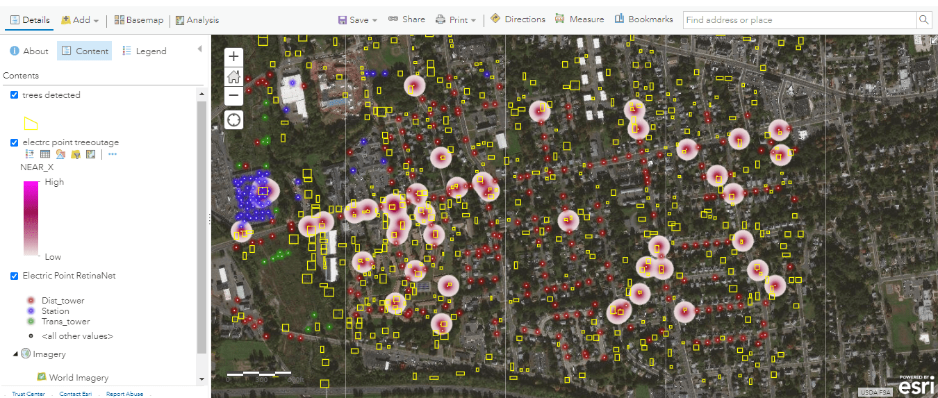 The green and red bounding boxes are trees and electric utility respectively. The red anchor show the electric utility object in range of 5m of tree and possible location of vegetation related outage, while yellow show at safe distance. We have published the outputs from this sample as a hosted feature layer.