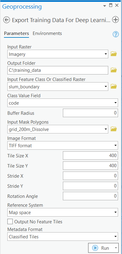 arcpy.ia.ExportTrainingDataForDeepLearning("Imagery", r"C:\training_data", "slum_boundary", "TIFF", 400, 400, 0, 0, "ONLY_TILES_WITH_FEATURES", "Classified_Tiles", 0, "code", 0, "grid_200m_Dissolve", 0, "MAP_SPACE", "PROCESS_AS_MOSAICKED_IMAGE", "NO_BLACKEN", "FIXED_SIZE")