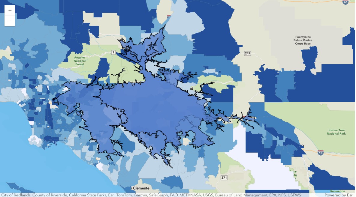 | 10 | 214 | 2 | USA | -117.19479 | 34.057265 | NetworkServiceArea | Minutes | Drive Time Minutes | 45.0 | BlockApportionment:US.BlockGroups;PointsLayer:... | ... | 15.19 | 0.305009 | Eastvale | 8.270909 | 503800.0 | 0.064508 | 57390709.253906 | 38277.204055 | 39.349068 | {"rings": [[[-13082747.7254, 4033299.2511], [-... |