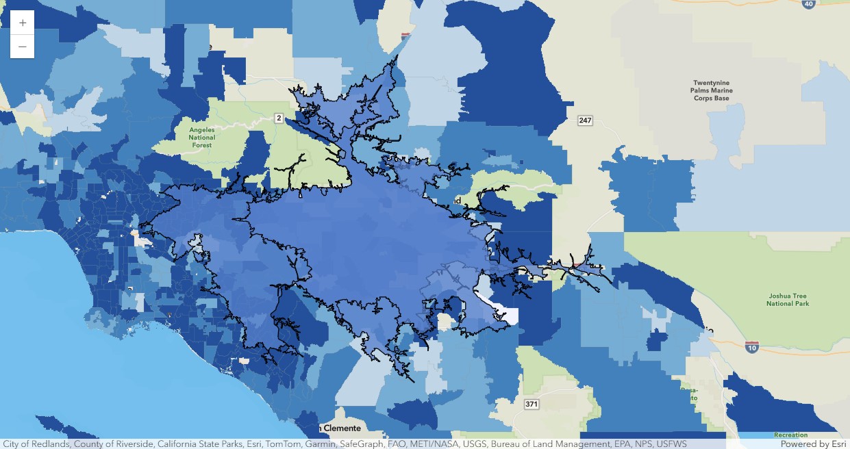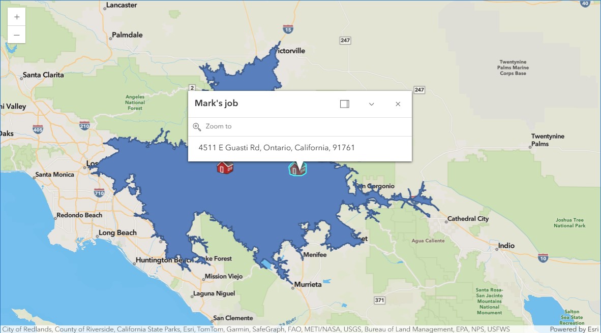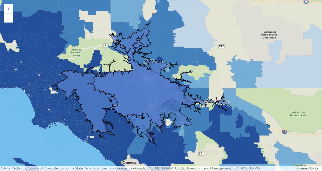| 1 | 4 | 1 | USA | -117.552866 | 34.064359 | NetworkServiceArea | Minutes | Drive Time Minutes | 45.0 | BlockApportionment:US.BlockGroups;PointsLayer:... | ... | 3.01 | 0.147502 | Los Angeles | 9.930192 | 472000.0 | 0.07689 | 11375466.695312 | 17800.685279 | 1.779017 | {"rings": [[[-13157514.1907, 4037443.2303], [-... |