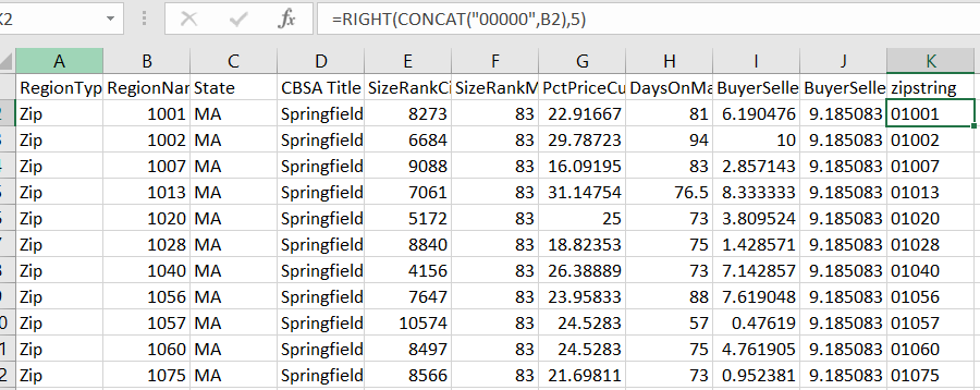 Notice that the RegionName field has ZIP Codes as numbers (if we sort the RegionName field we will notice the ZIP Codes for Massachusetts, for example, don't have leading zeros; 01001 is 1001). Also, notice the median home value columns are named using the year and month. The first data available is for April 1996 (1996-04).
