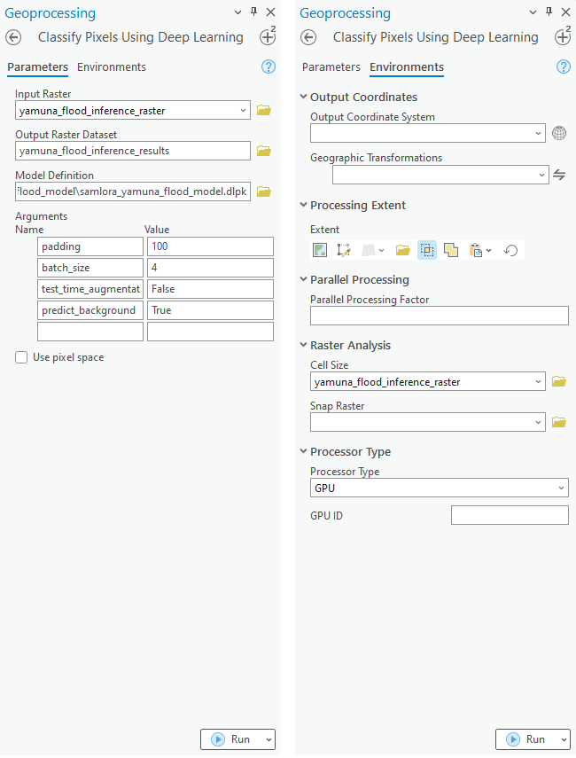 After training the SamLoRA model and saving the weights for classifying images, we can use the Classify Pixels Using Deep Learning tool available in ArcGIS Pro and ArcGIS Enterprise for inferencing.
