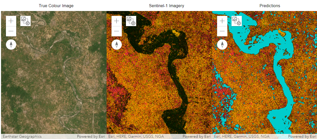 Three map widgets were created. The left widget displays natural color high resolution satellite imagery prior to flooding, the middle widget displays the Sentinel-1 imagery during the flood event, and the right map widget displays the predictions of the trained SamLoRA model. In the maps, Delhi and other cities of the National Capital Region of India can be seen on both sides of the Yamuna river. The model is able to identify all the flooded regions. The True Color Imagery can be used for visual interpretation for model accuracy.