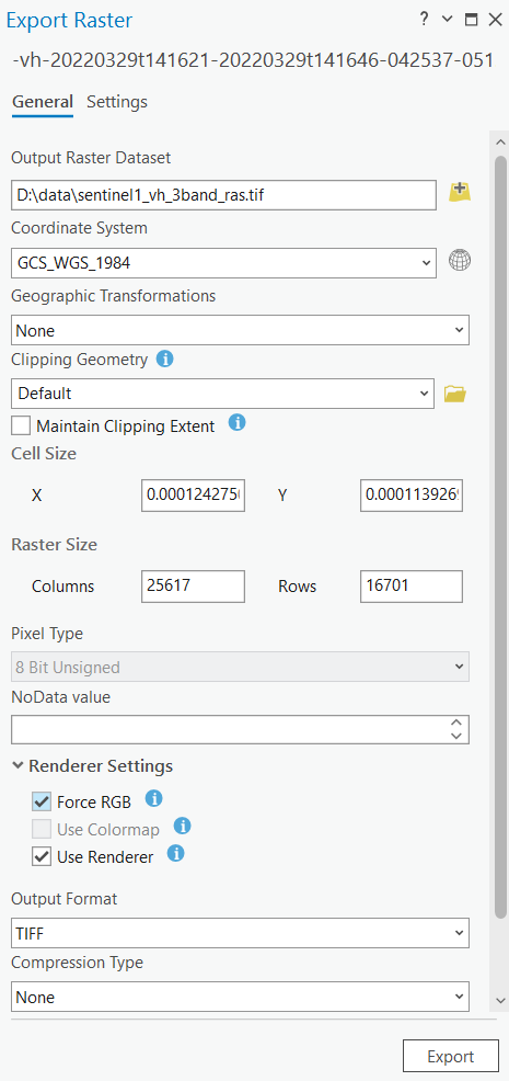 Here, we convert the Sentinel-1 GRD VH polarization band to a 3 band raster using Export Raster. Under the Render Settings section, once Use Renderer is checked, Force RGB will be enabled.
