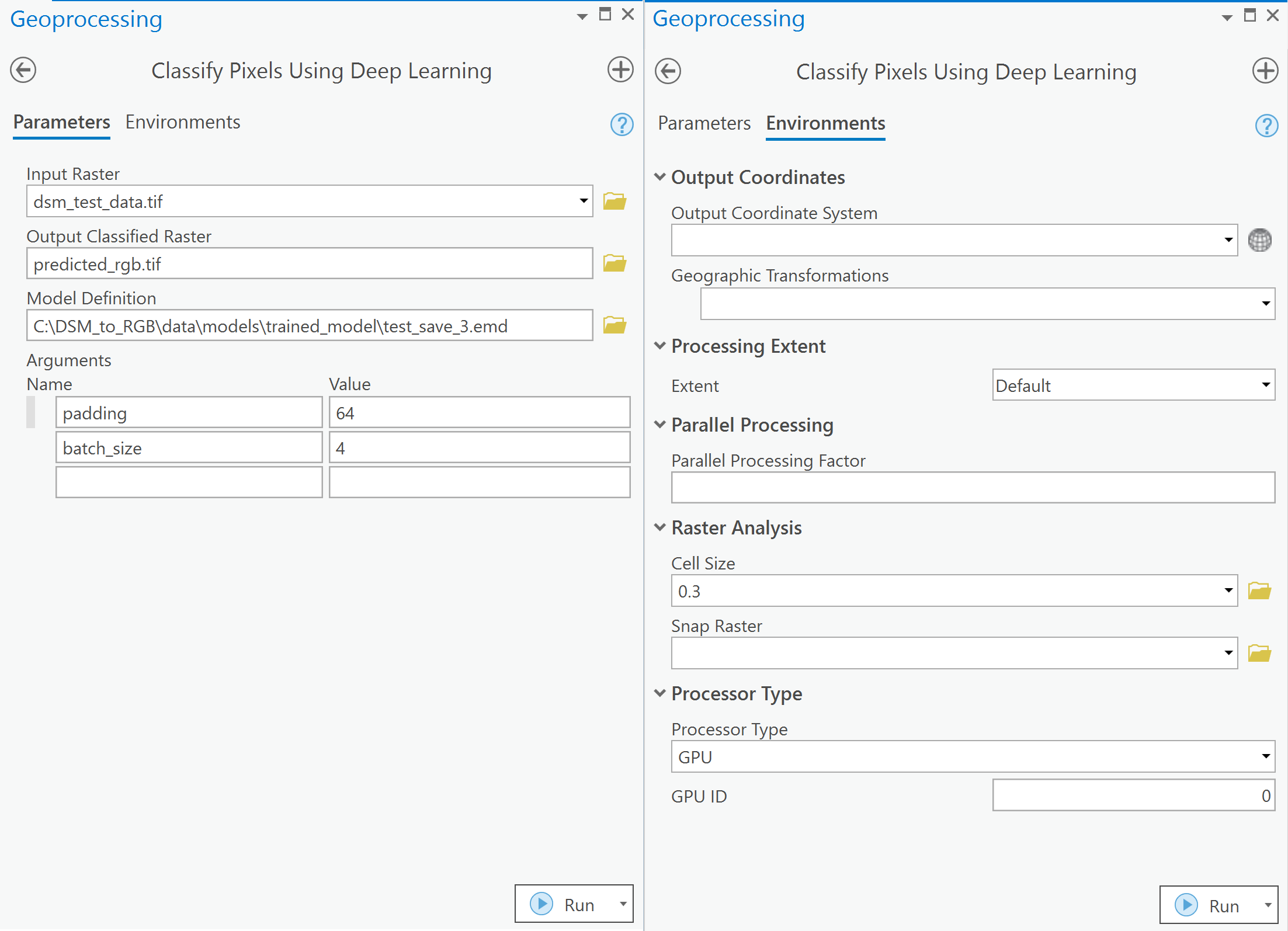 out_classified_raster = arcpy.ia.ClassifyPixelsUsingDeepLearning("Imagery", r"C:\path\to\model.emd", "padding 64;batch_size 2"); out_classified_raster.save(r"C:\sample\sample.gdb\predicted_img2dsm")