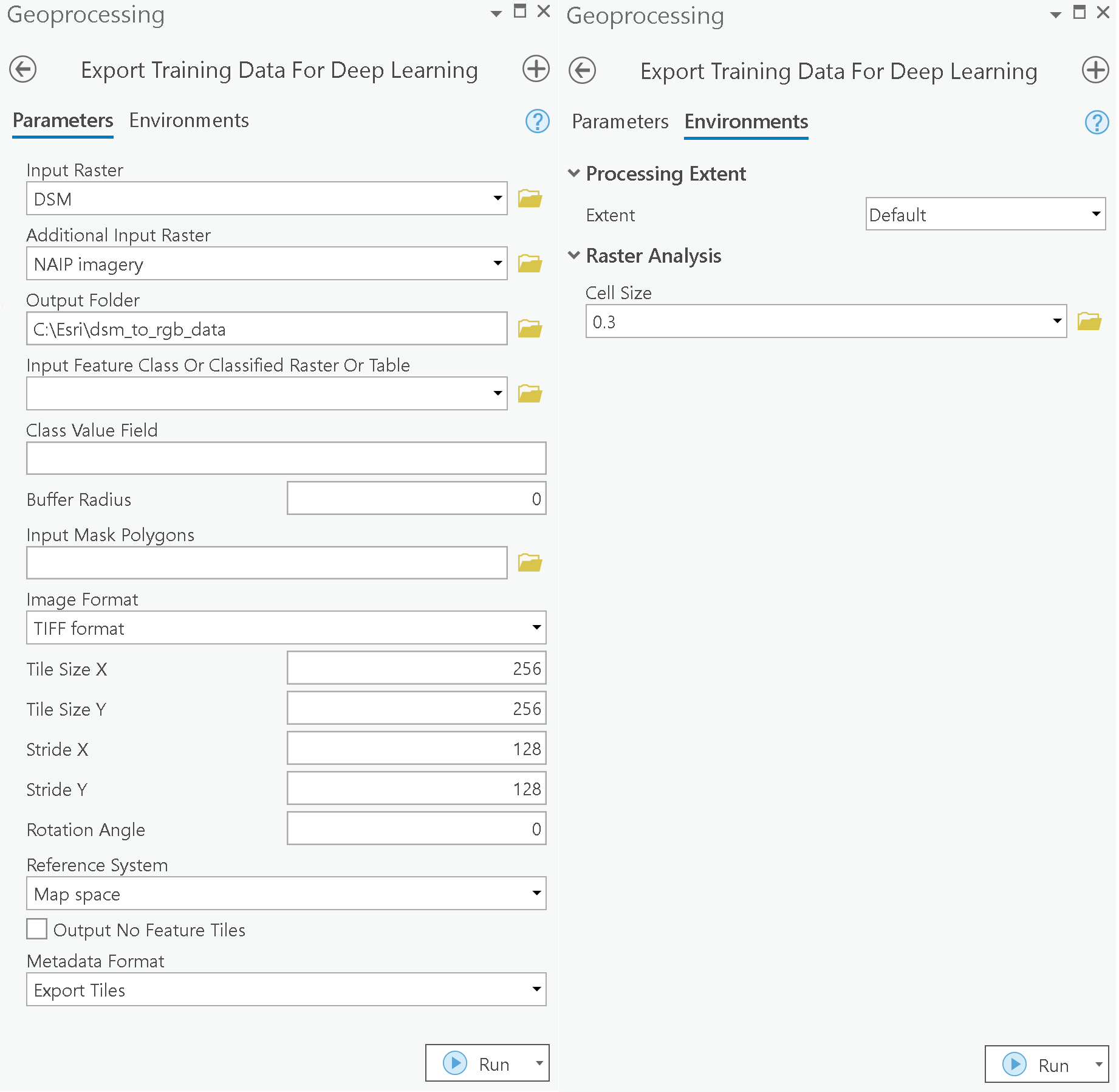Input Raster: DSMAdditional Input Raster: NAIP airborne imageryTile Size X & Tile Size Y: 256Stride X & Stride Y: 128Meta Data Format: 'Export_Tiles' as we are training aPix2Pixmodel.Environments: Set optimumCell Size,Processing Extent.