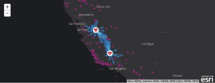 In this notebook, we will use the solve_location_allocation tool to find the best locations for new ALS clinics in California. Inputs to this tool include FeatureSets containing the following data: