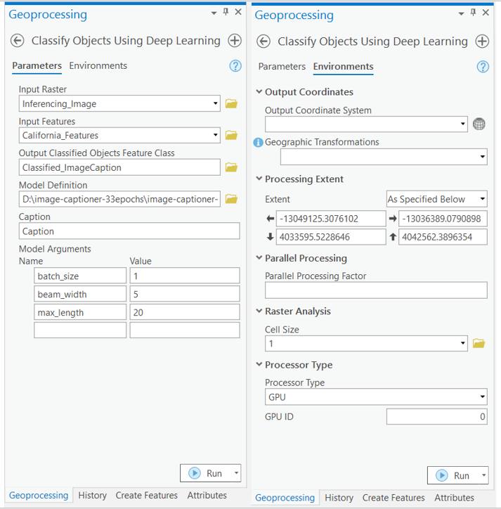 arcpy.ia.ClassifyObjectsUsingDeepLearning("Inferencing_Image", r"C:\Users\Admin\Documents\ImgCap\captioner.gdb\Classified_ImageCaptions", r"D:\image-captioner-33epochs\image-captioner-33epochs.emd", "California_Features", '', "PROCESS_AS_MOSAICKED_IMAGE", "batch_size 1;beam_width 5;max_length 20", "Caption")