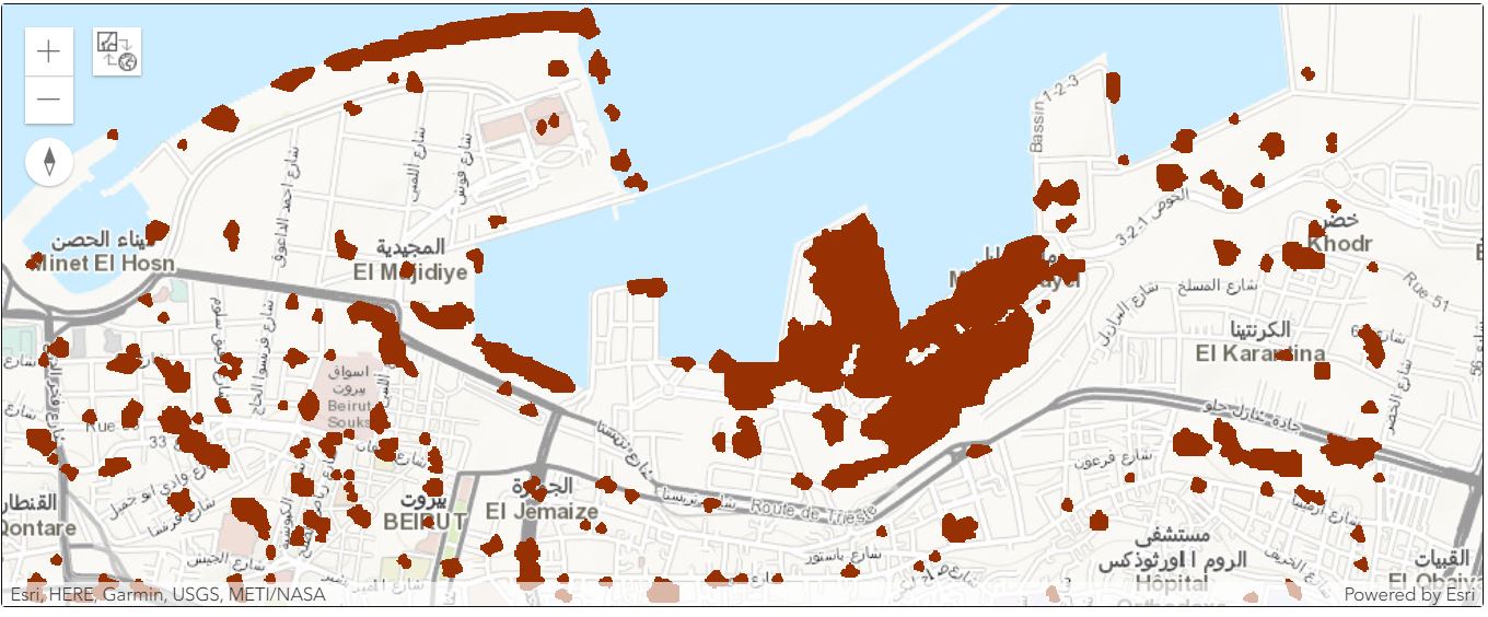 The map widgets shows buildings which were damaged due to the explosion. Infrastructure on port was fully damaged due to the explosion and the buildings in the buffer area of 10 km were partially damaged. According to reports, approximately 7km infrastructure was damaged due to explosion.