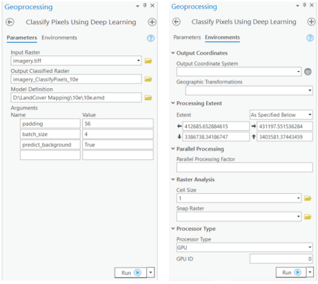 Input Raster: The raster layer you want to classify.Model Definition: It will be located inside the saved model in 'models' folder in '.emd' format.Padding: The 'Input Raster' is tiled and the deep learning model classifies each individual tile separately before producing the final 'Output Classified Raster'. This may lead to unwanted artifacts along the edges of each tile as the model has little context to predict accurately. Padding as the name suggests allows us to supply some extra information along the tile edges, this helps the model to predict better.Cell Size: Should be close to the size used to train the model. This was specified in the Export training data step.Processor Type: This allows you to control whether the system's 'GPU' or 'CPU' will be used to classify pixels, by 'default GPU' will be used if available.